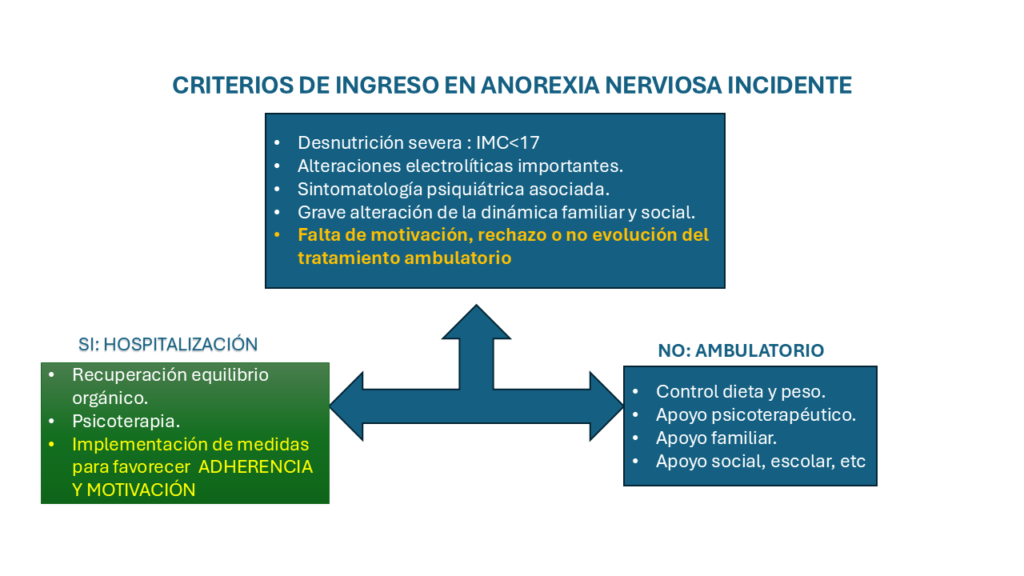 Los criterios de ingreso expresados a continuación no son exhaustivos. Según mi opinion, hay un solo criterio si tomamos como objetivo el impedir la cronificación del trastorno alimentario. Para ello, hay que diferenciar claramente los casos incidentes con claros signos de inadherencia al tratamiento, de aquellos que presentan una evolución superior a los dos años. En los primeros, hablamos de una prevención secundaria, en los segundos de prevención terciaria. La evidencia nos indica que solo la prevención primaria presenta oportunidades objetivas de recuperación total de la enfermedad, y no en todos los casos.